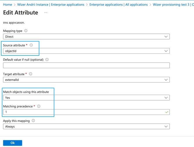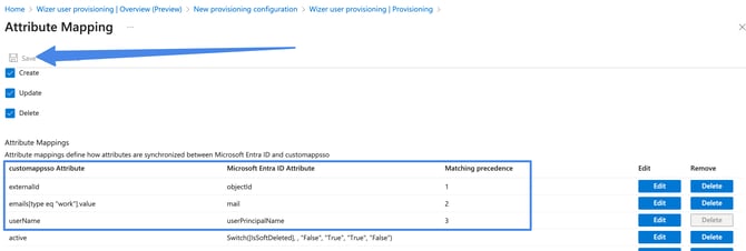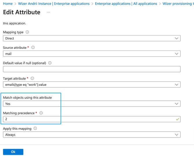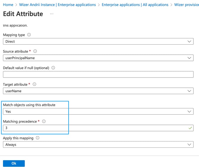 For now, the Wizer application synchronizes only first name, last name, email, and department fields. But we plan to add support for other fields later, so it’s better to leave all the other attributes unchanged.Please note, per above the UPN (user principal name) synced only in case the mail field is empty. If the mail field is empty, upn will be synced as email in Wizer instead of the mail fieldIf you don’t want to synchronize user departments with Wizer departments you can turn it off by deleting the “department” field from mapping.