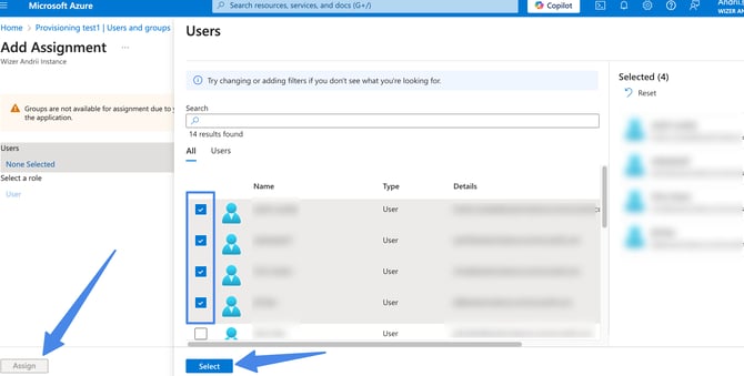 On the Add assignment screen, choose Users and groups tab, then select users and groups from the list. Then click the Assign button