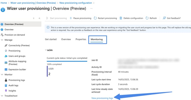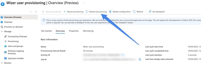 After the possible errors have been addressed, the provision should happen automatically in the next few hours, or you can restart the full synchronization manually by clicking Restart Provisioning.