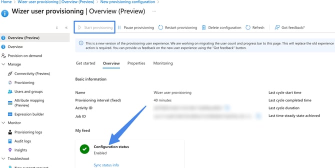 Alternatively, you can press on the start provisioning option, once the process runs you will see the configuration status as enabled: