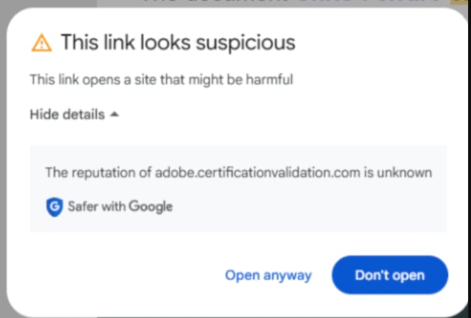 In case you are seeing the "This link looks suspicious"/"This link opens a site that might be harmful" message when trying to click on the phishing link in the simulation email like the one below:
