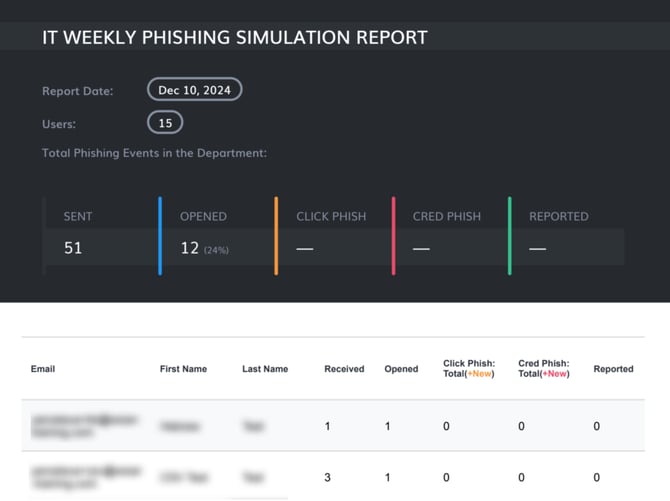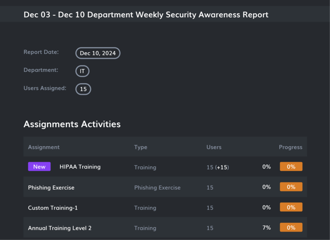When the Weekly Report is set up, every Monday, the recipients receive reports on Training and Phishing Simulation activity and users' progress. Below are examples of the weekly reports.