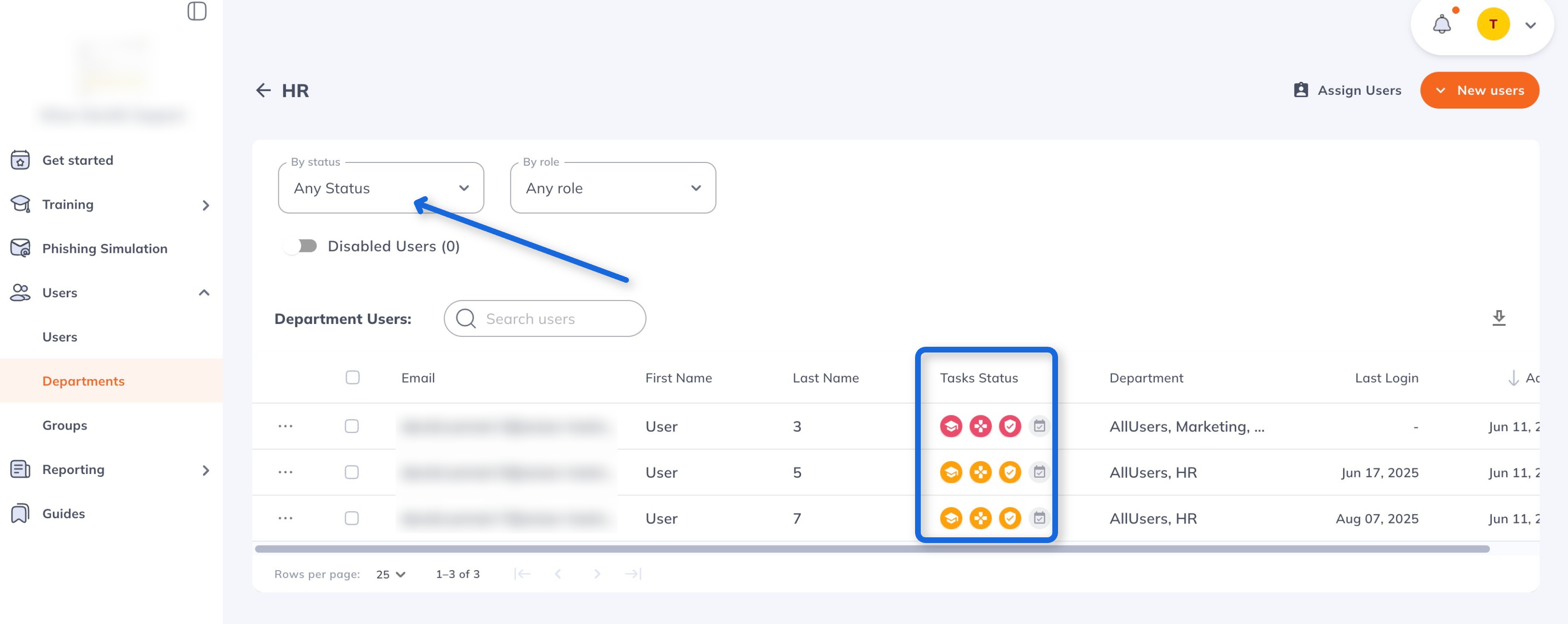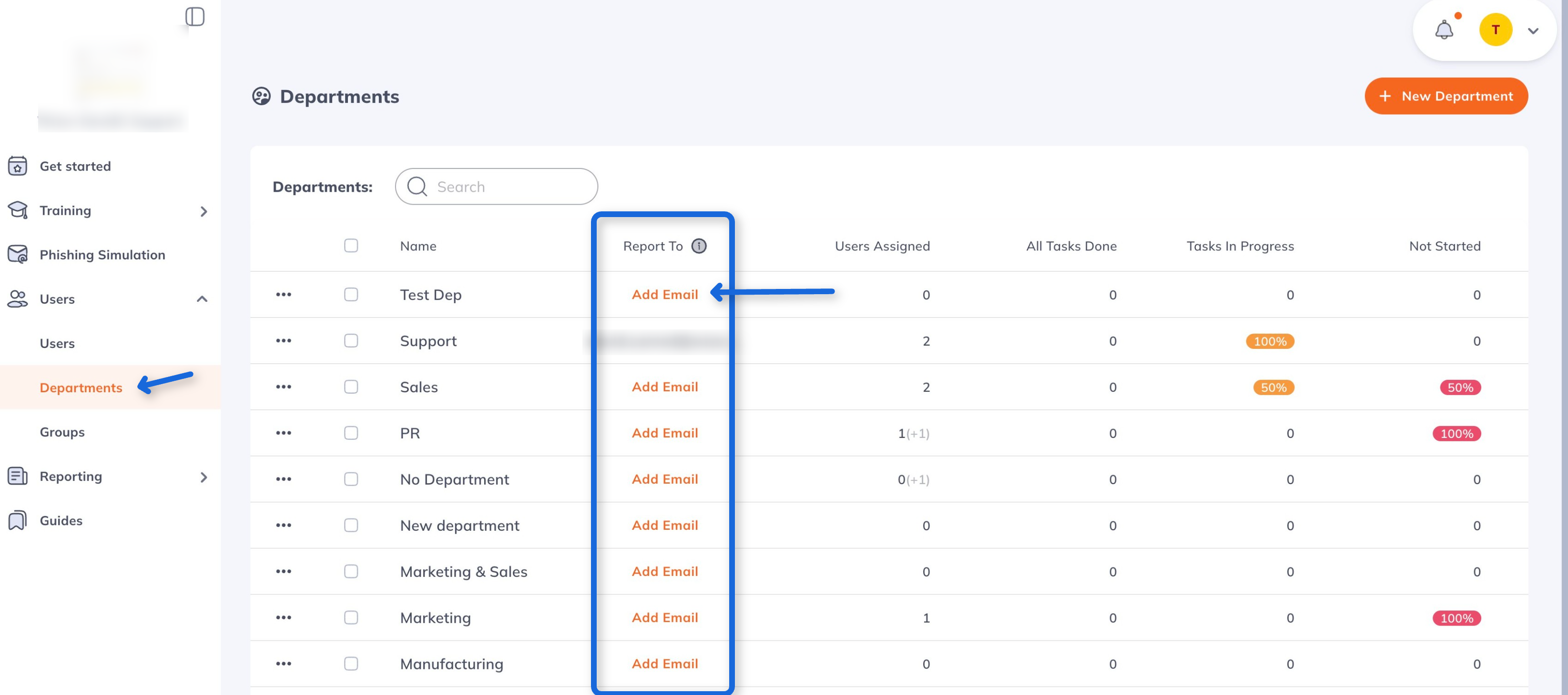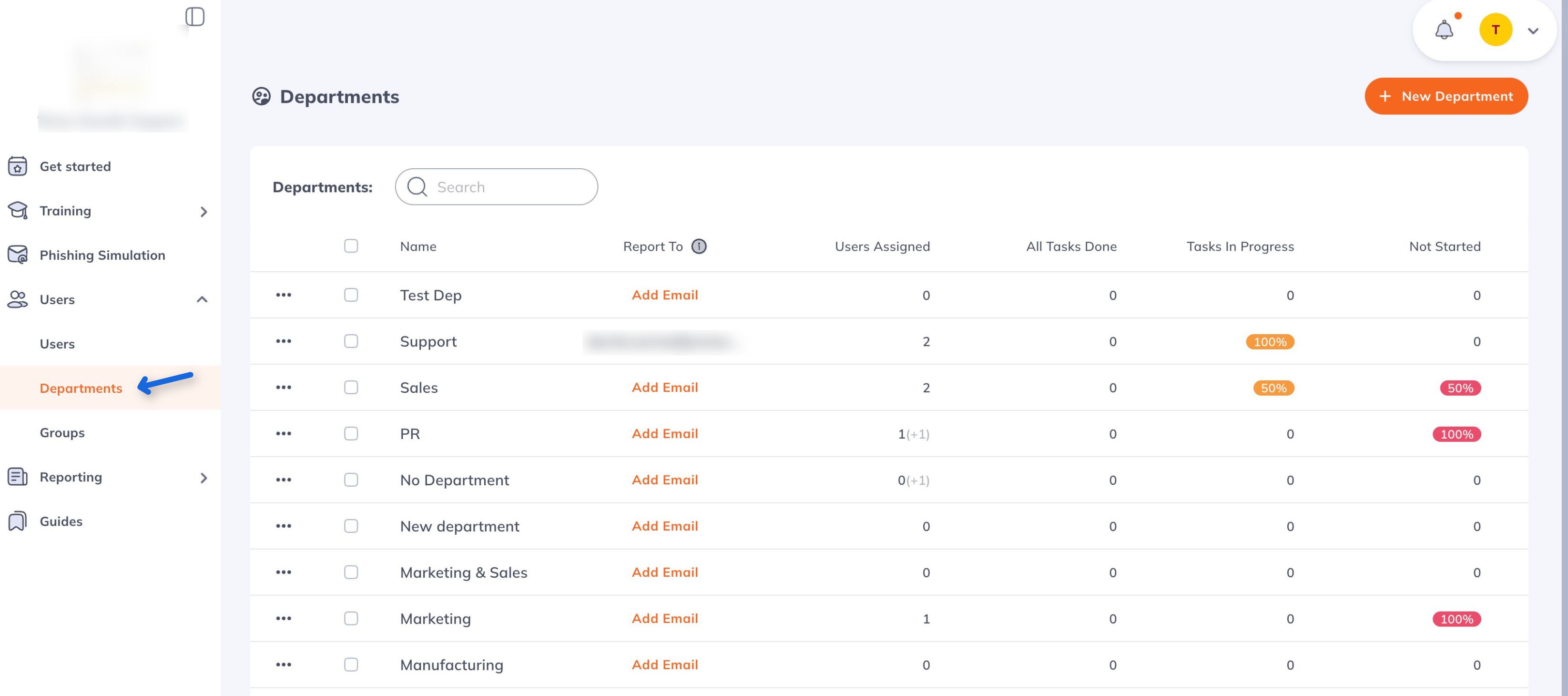 - Click on the "Departments" tab under the "Users" section on the left side menu to view department progress as pictured below.