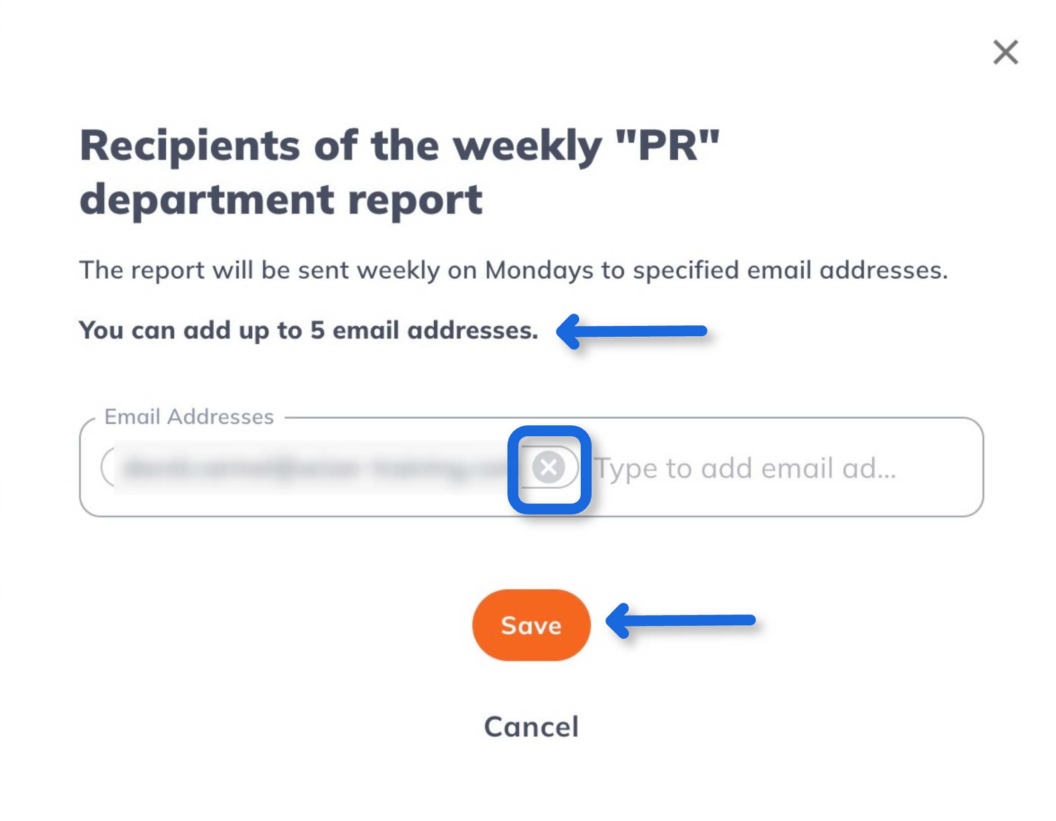 Clicking on Add Email allows you to subscribe up to five recipients to the weekly department progress report. These recipients can be Admins, Learners, or even individuals not invited to the platform.