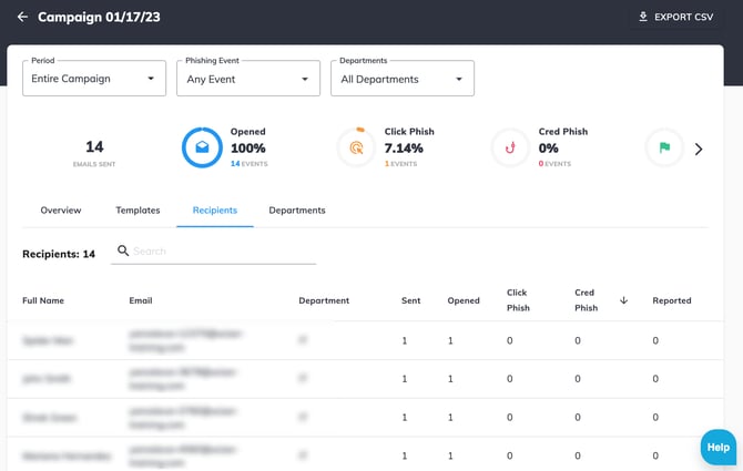 View real-time stats for Emails Sent, Opened, Clicked, and Phished. -